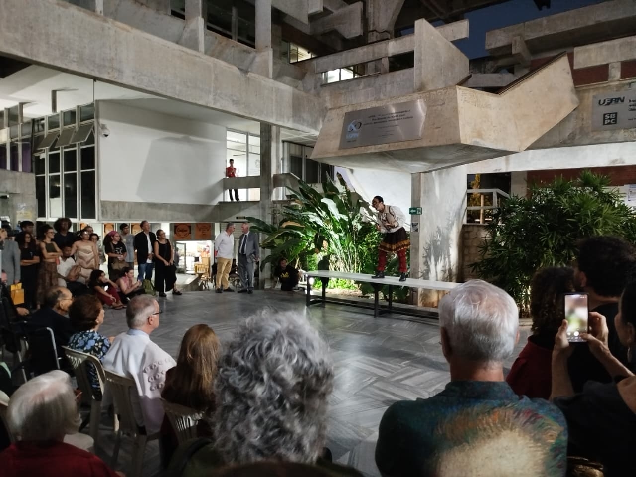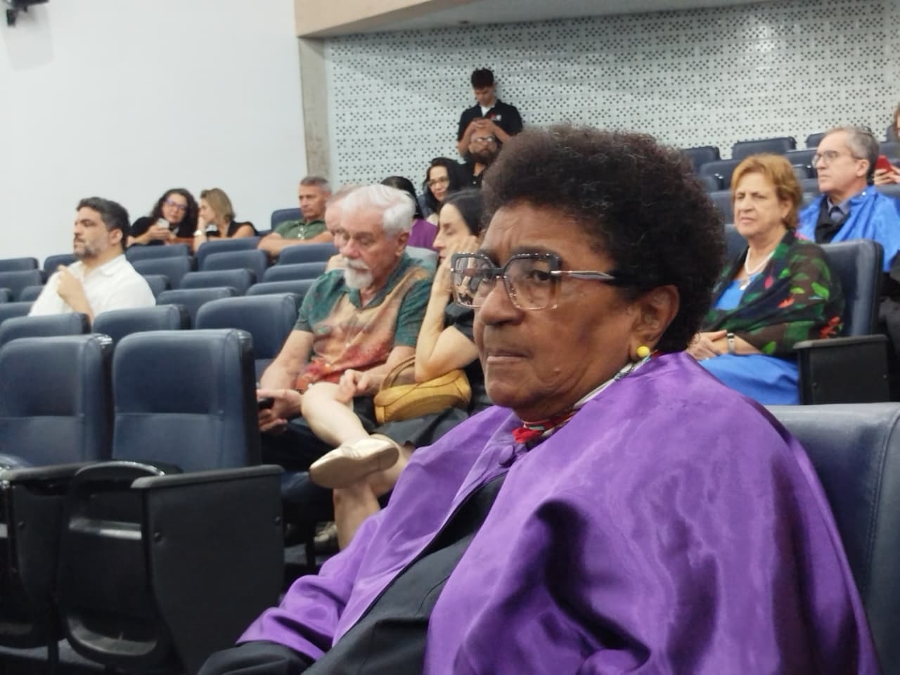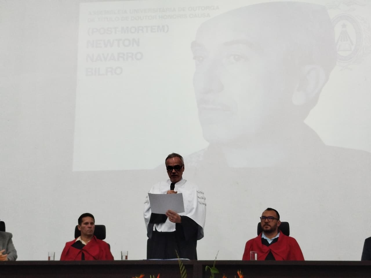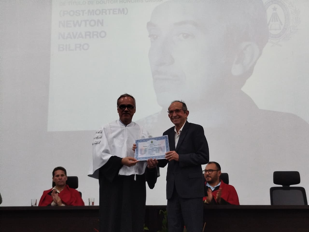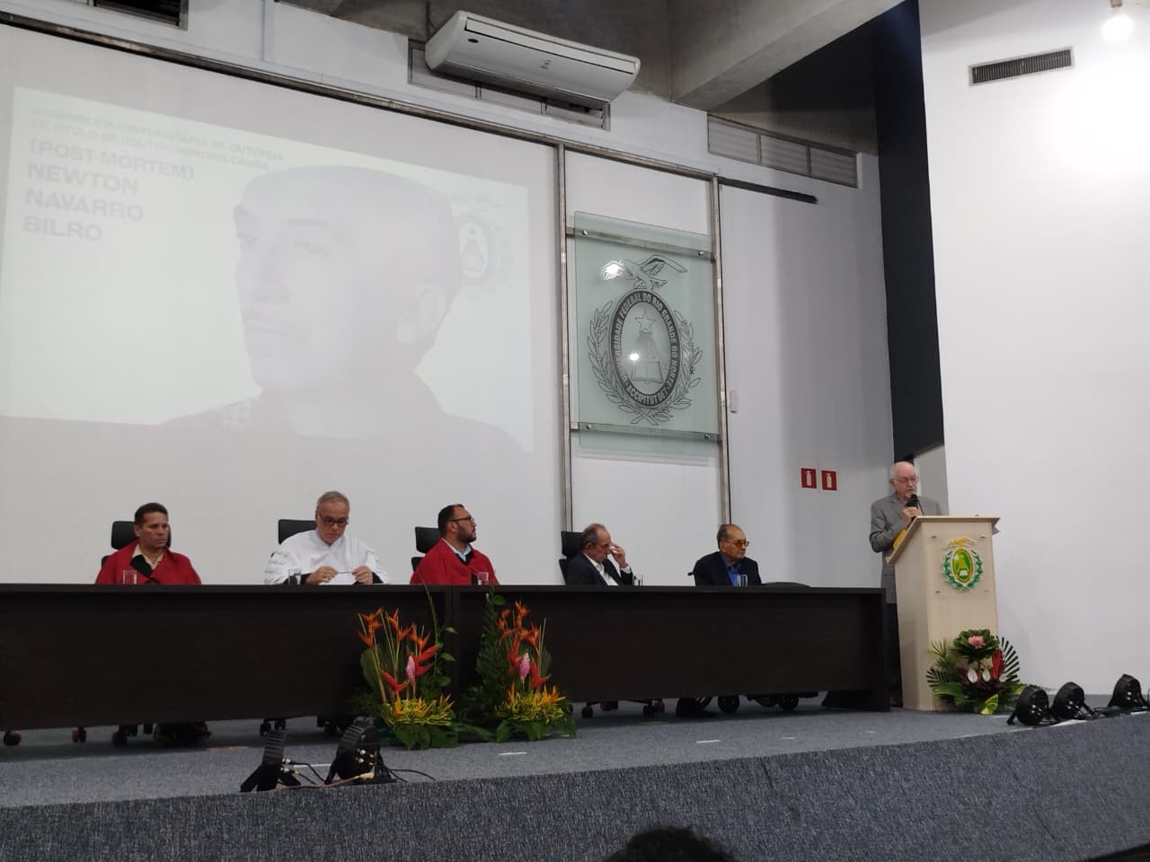 Na noite desta quinta-feira (9), a UFRN prestou homenagem ao dramaturgo, poeta, desenhista e pintor potiguar Newton Navarro, concedendo-lhe o título de Doutor Honoris Causa. A cerimônia celebrou a vida e a obra de Newton, um dos maiores nomes da cultura do Rio Grande do Norte. A professora Vilma Vitor, diretora do ADURN-Sindicato, acompanhou a solenidade.