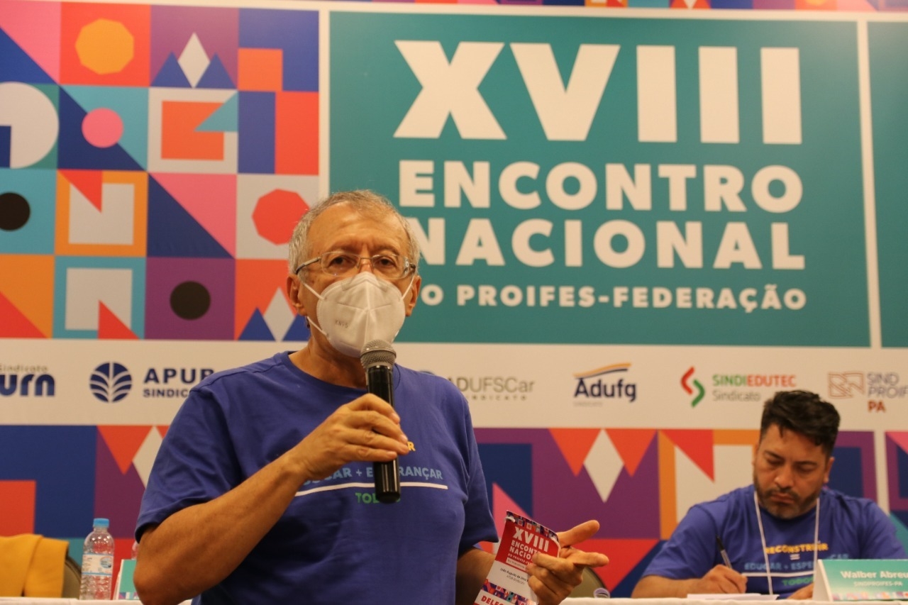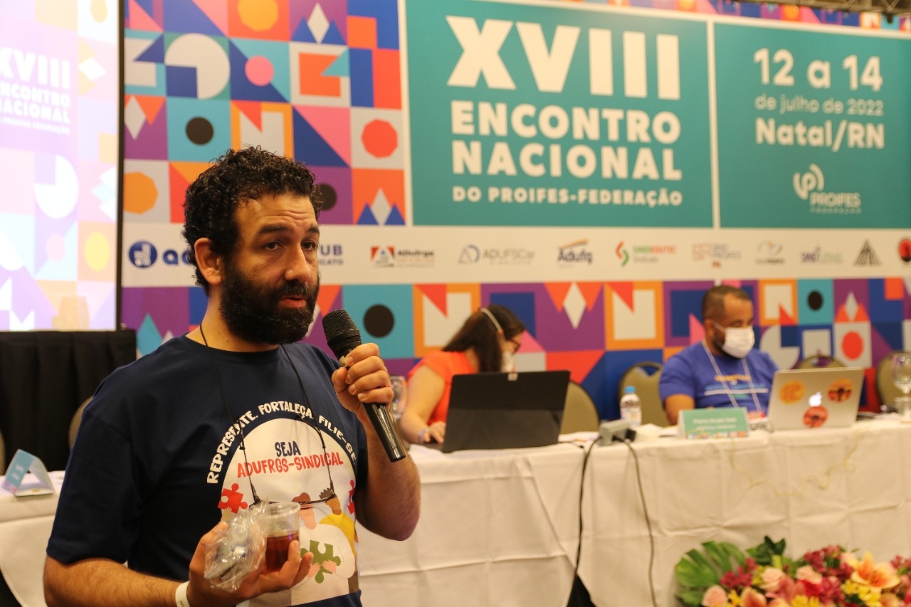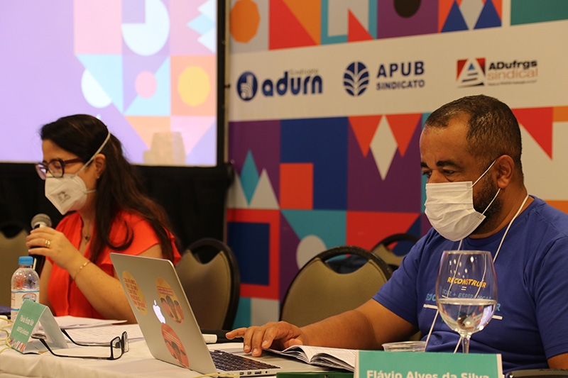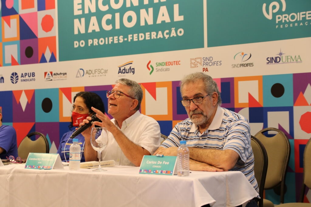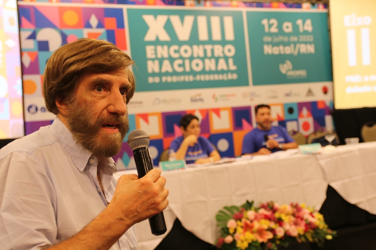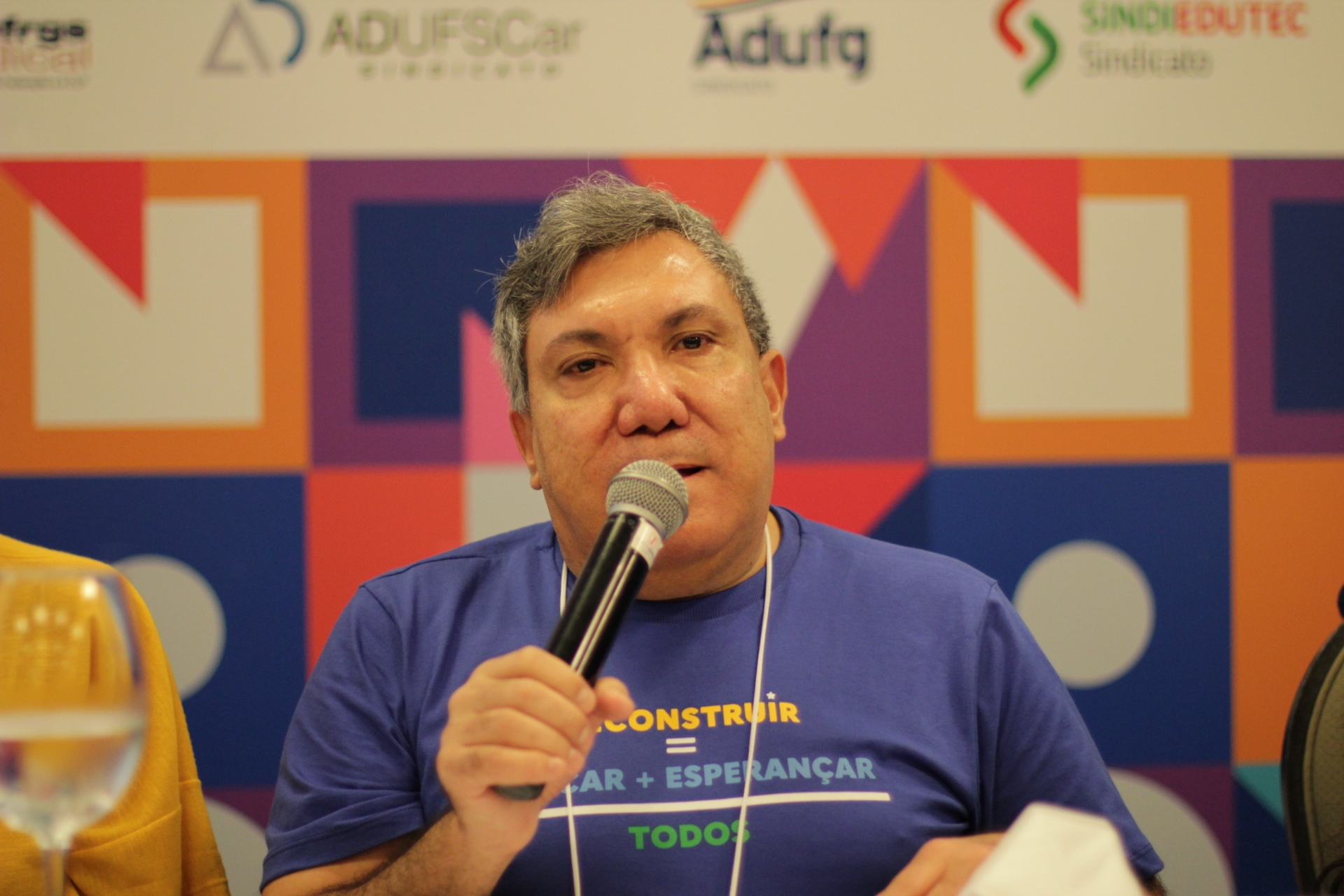 Após a mesa de discussões que abriu os trabalhos do dia reunindo especialistas em educação para traçar um panorama do ensino na América Latina, os professores participaram do Eixo I de debates intitulado “A crise na sociedade brasileira, seu aprofundamento em 2022 e os reflexos das IFES”.