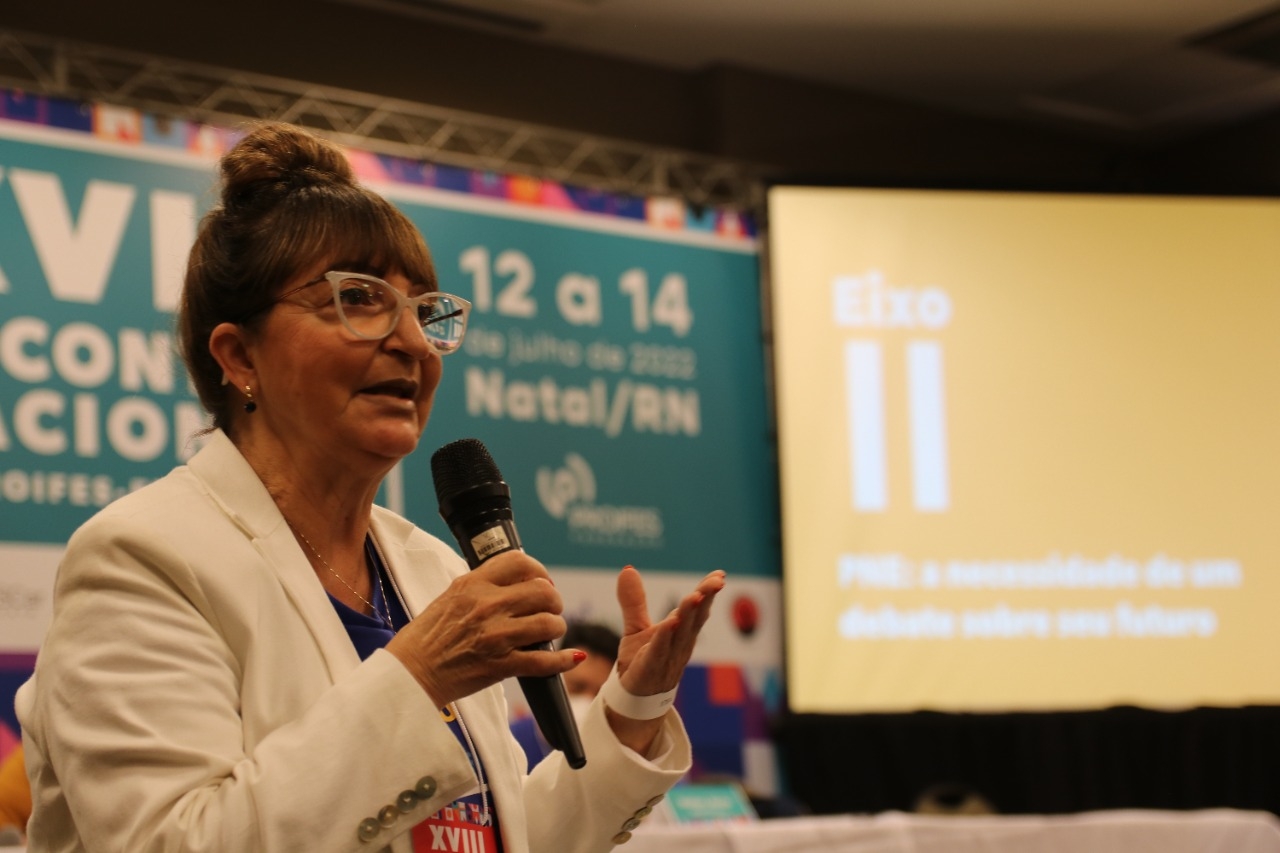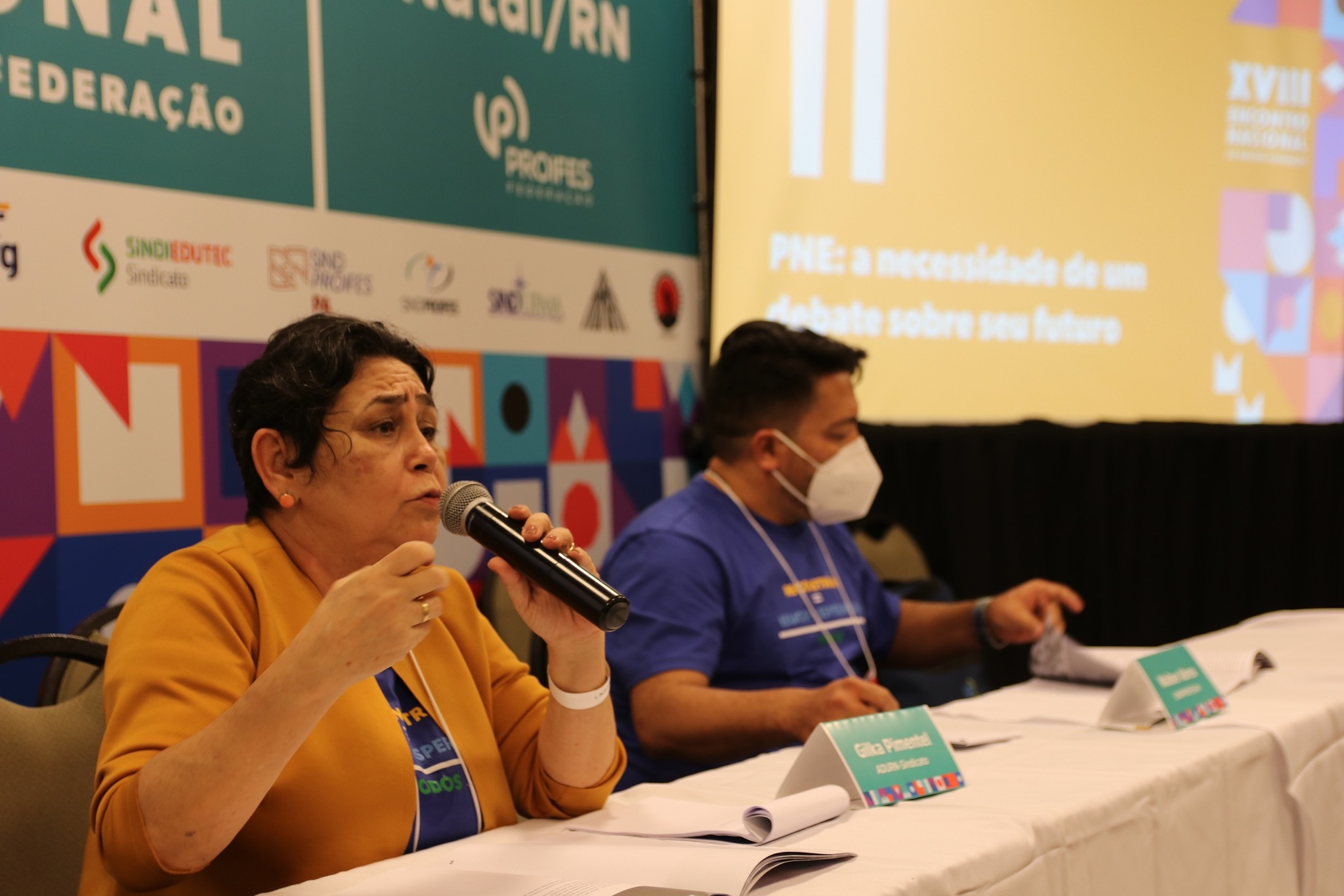 O início da tarde do segundo dia do encontro (13/07), foi dedicado para discutir o Plano Nacional da Educação (PNE). Os textos desse eixo explicitaram a necessidade de um debate sobre o futuro e foram explanados pelos proponentes Sônia Mara Ogiba (Diretora do Proifes Federação), Maria Cristina Martins (ADUFRGS-Sindical), Marcos de Oliveira Soares (ADUFSCAR Sindicato) e Gil Vicente (ADUFSCAR Sindicato).