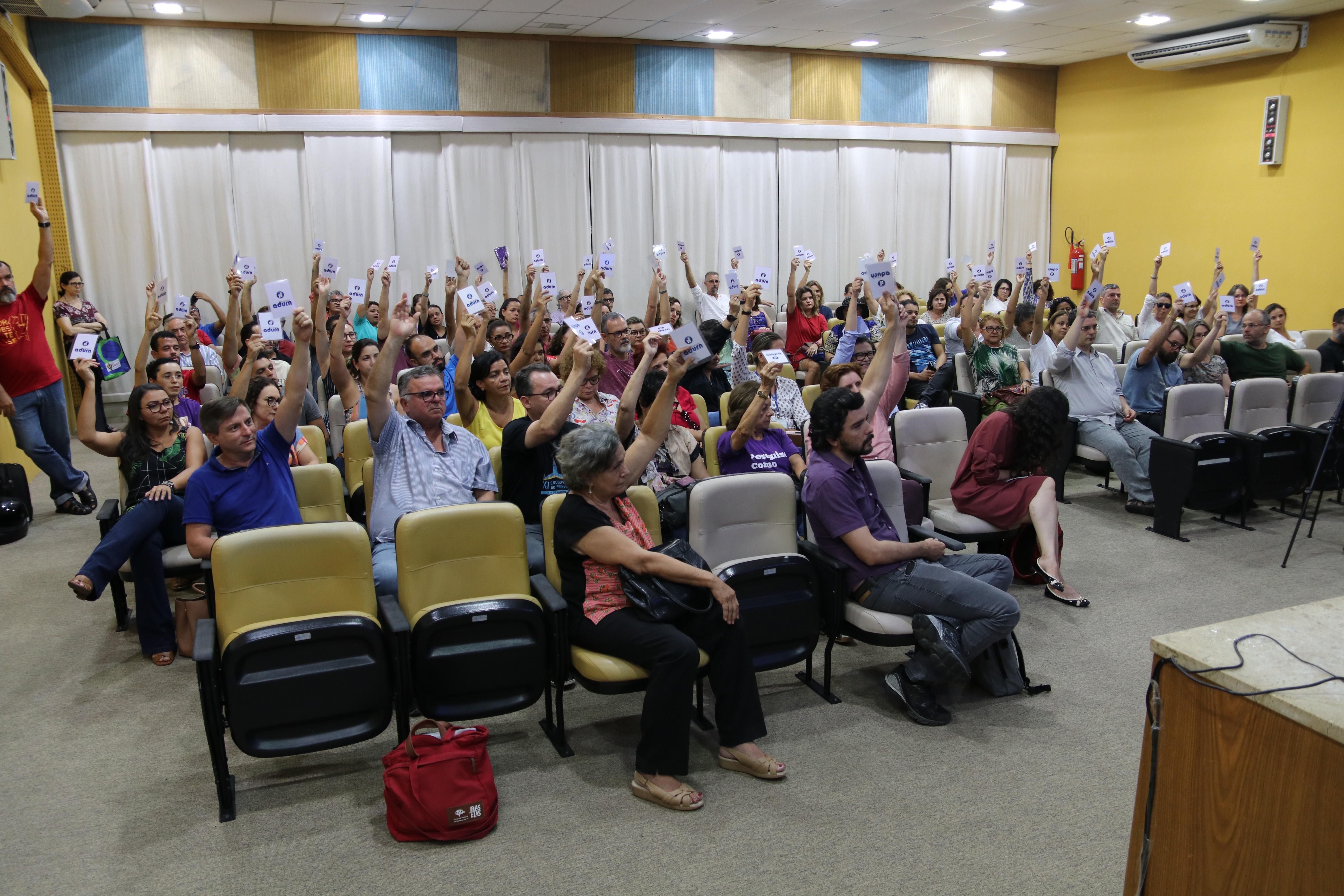 Frente ao processo de desmonte das políticas públicas educacionais, cortes orçamentários na Educação, especialmente no Ensino Superior, dos riscos de desconstitucionalizar direitos e acabar com o sistema público, os docentes da Universidade Federal do Rio Grande do Norte aprovaram indicativo de greve em assembleia realizada nesta segunda-feira, 9, no auditório da Biblioteca Central Zila Mamede, campus central da UFRN.