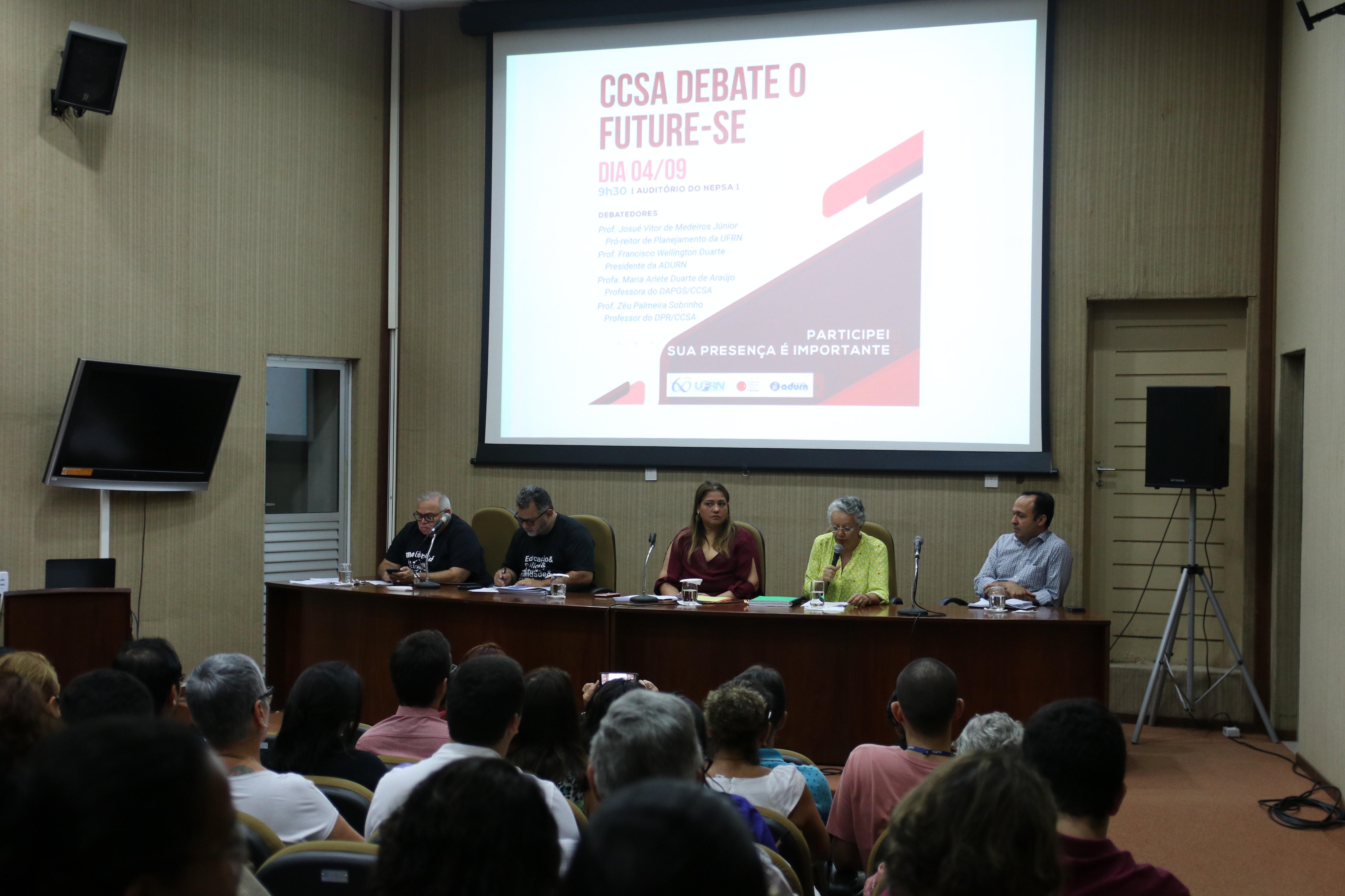 O CCSA promoveu na última quarta-feira (4), no auditório do Nepsa 1, um debate sobre o Future-se, com exposições do pró-reitor de Planejamento, Josué Medeiros, do presidente do ADURN-Sindicato, Wellington Duarte, e dos professores Maria Arlete Duarte de Araújo, do Departamento de Administração Pública e Gestão Social (DAPGS/CCSA), e Zéu Palmeira Sobrinho, do Departamento de Direito Privado (DPR/CCSA) e juiz do Trabalho.