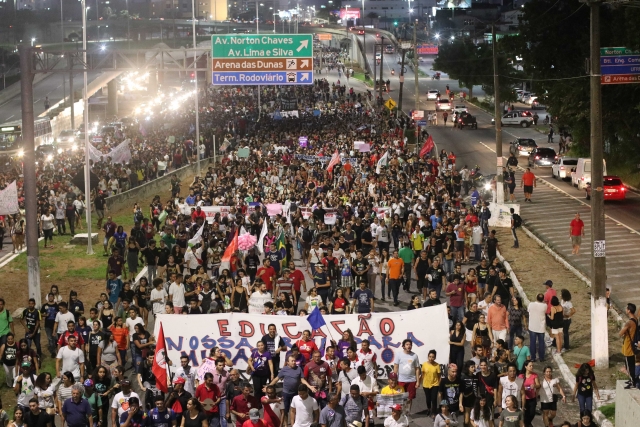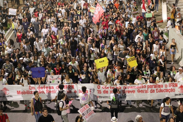 Em dia histórico, mais de 80 mil protagonizam Greve Nacional da Educação no maior ato de rua da capital potiguar desde a eleição de Jair Bolsonaro (PSL) e fizeram ecoar a disposição em barrar a agenda de desmonte das políticas educacionais. Movimentação de dimensão nunca vista tomou as ruas de Natal nesta quarta-feira (15) numa demonstração de apoio da população e unidade do sindicalismo e dos movimentos sociais, Frente Brasil Popular e Frente Povo sem Medo, junto a setores significativos da Educação e outros segmentos.