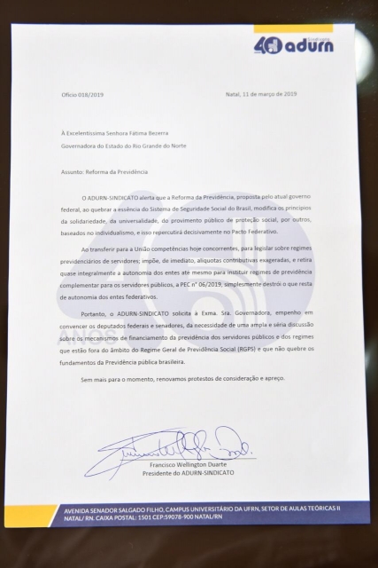 Em audiência nesta segunda-feira, 11 com a governadora Fátima Bezerra e o vice, Antenor Roberto, o presidente do ADURN-Sindicato, Wellington Duarte, tratou dos cenários e perspectivas para o Estado, municípios e os servidores públicos com a Proposta de Emenda Constitucional nº 6 de 2019, mais conhecida por Reforma da Previdência, que altera drasticamente as regras de concessão de aposentadorias, com mudanças como o aumento do tempo de contribuição, restrição do acesso e redução do valor dos benefícios. Fotos: Elisa Elsie