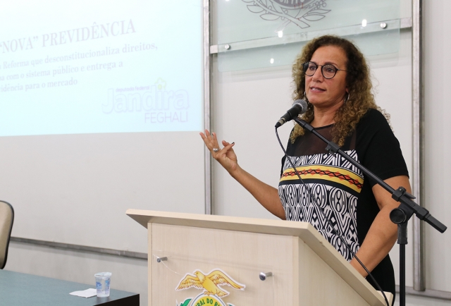Crítica à Proposta de Emenda à Constituição (PEC) nº 6/2019 enviada pelo governo federal ao Congresso em fevereiro, a deputada Jandira Feghali (PCdoB-RJ), líder da Minoria na Câmara dos Deputados, esteve em Natal no dia 28 de março para a 11ª edição do Projeto Na Trilha da Democracia.