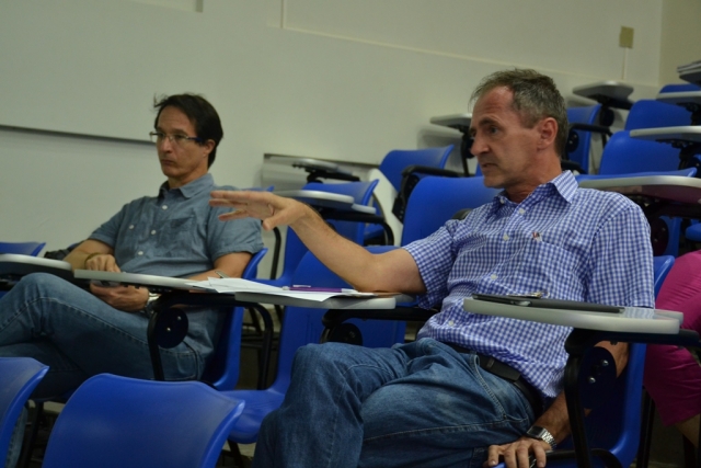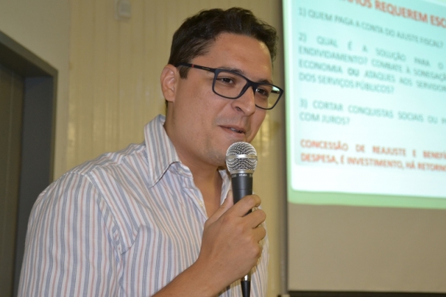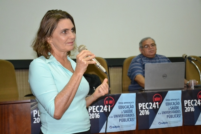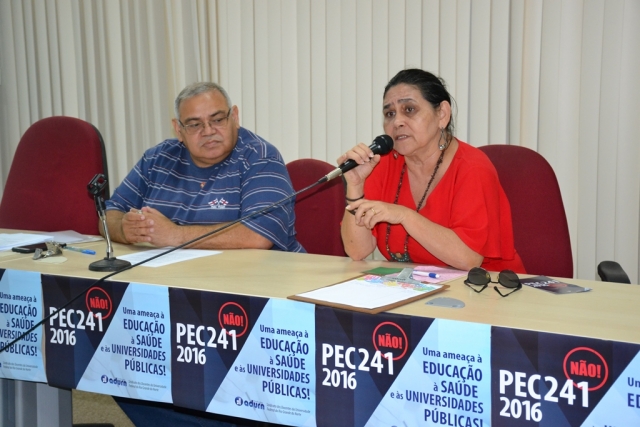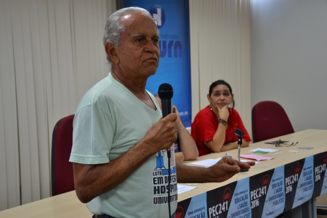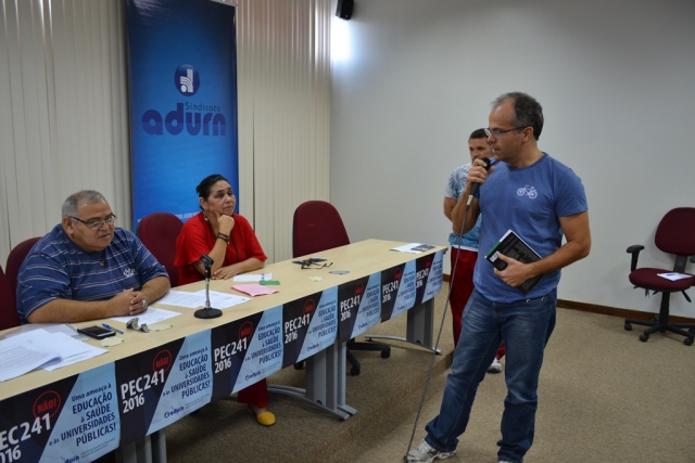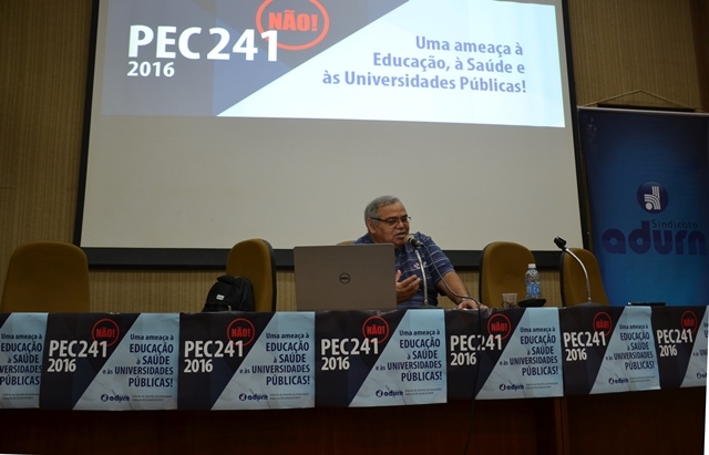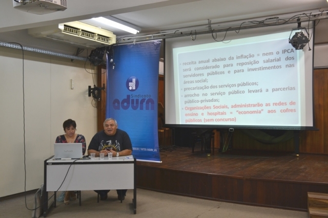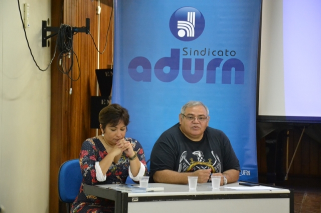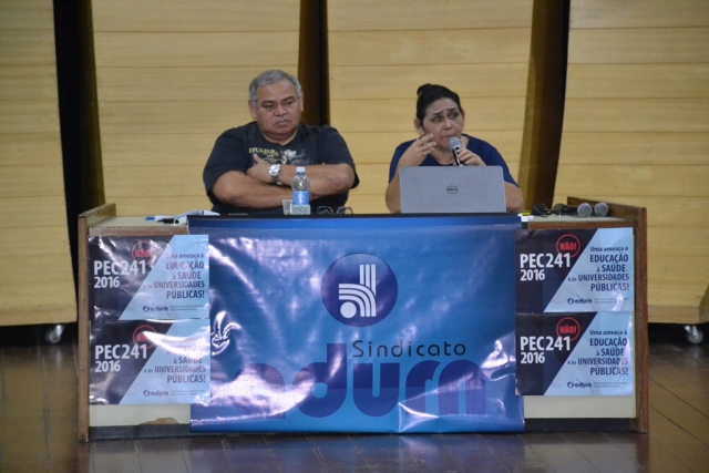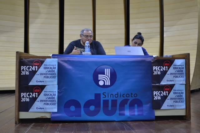 Dando seguimento ao ciclo de debates sobre a PEC 241/2016, o presidente do ADURN-Sindicato, Wellington Duarte, e a assessora jurídica da Entidade, Andreia Munemassa, estiveram no Centro de Ciências Exatas e da Terra para conversar com os docentes acerca das ameaças que estão sendo impostas à educação e à saúde através desse projeto.