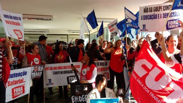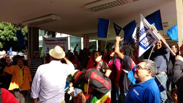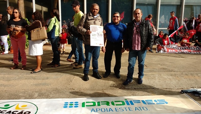Cerca de 800 trabalhadores em educação de todo o país estiveram reunidos numa grande mobilização, durante toda a quarta-feira (29), em frente ao Ministério da Educação (MEC), em Brasília. O PROIFES-Federação esteve representado por dirigentes de diversas partes do Brasil, entre eles a vice-presidente do ADURN-Sindicato, Gilka Pimentel.