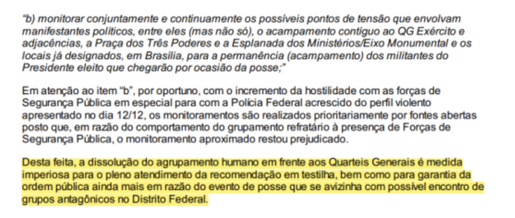 Na ocasião, relataram que “o acampamento dos manifestantes contrários ao resultado do pleito eleitoral” estava sendo “constantemente monitorado, inclusive para averiguação de possíveis atos criminosos atribuídos aos manifestantes e a pessoas que transitam no local”.
