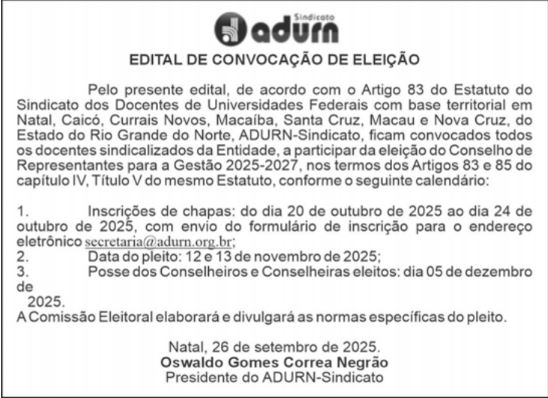 Confira abaixo o Edital de Convocação para o pleito, publicado no dia 26 de setembro de 2025, no jornal Tribuna do Norte: